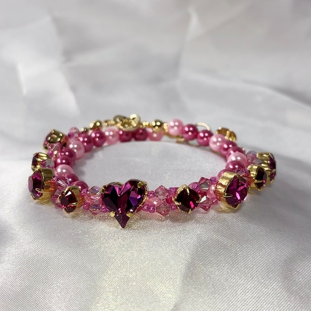 首に巻いてチョーカーに、手首に2重で巻いてブレスレットに、と2wayで使えるアクセサリーです。 ハートがダークローズ、その他ルビー・フューシャなども使用して濃い目のピンクで仕上げました。 パールも濃いピンク+ピンク。 サイドのチャームは薔薇。 カニカンでサイドで着脱。 全長約39,5cm