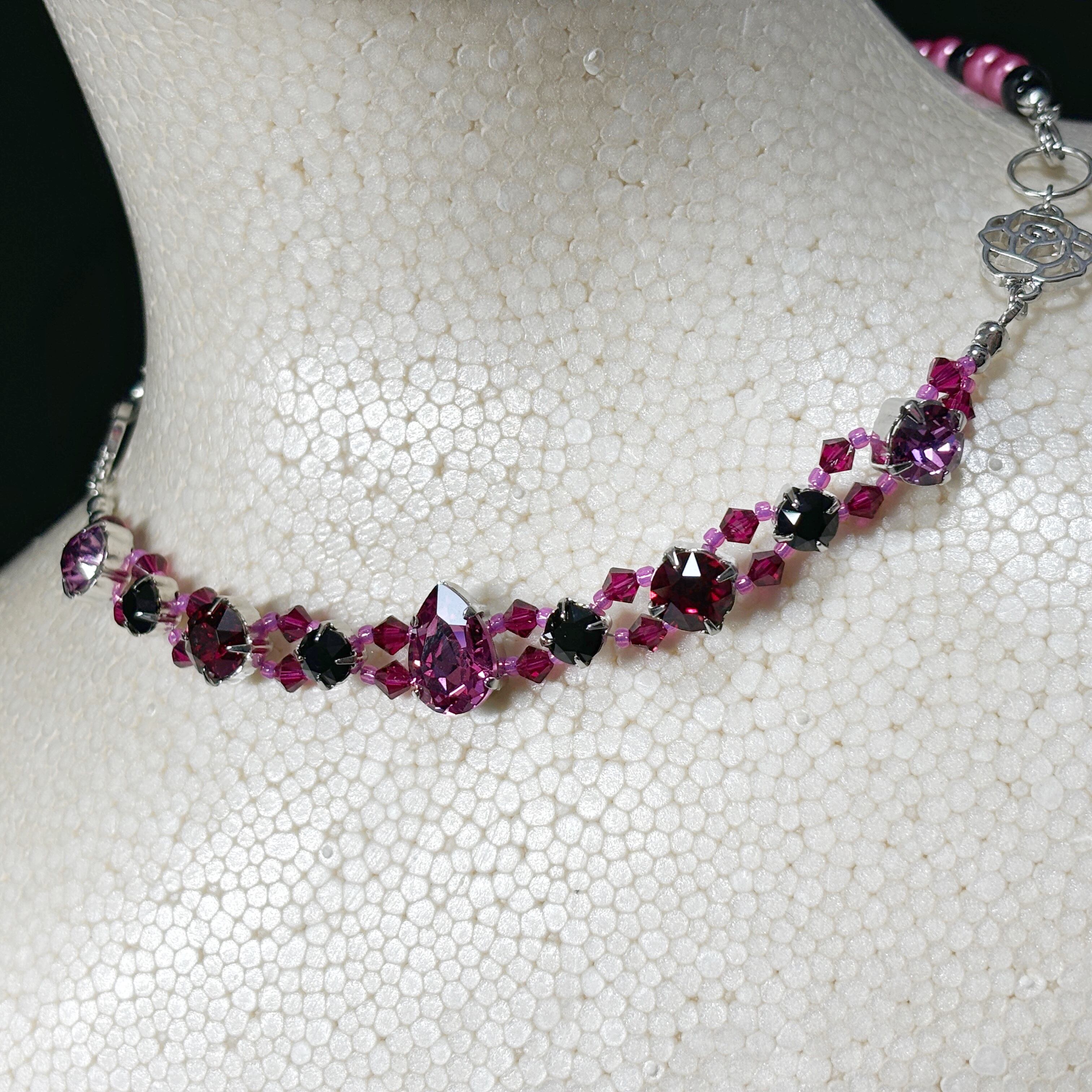 ダークローズの貴和クリスタルをメインに、ジェット、ルビーの貴和クリスタル・スワロを使っています。パールは黒とチェリーピンク。金具はシルバー。