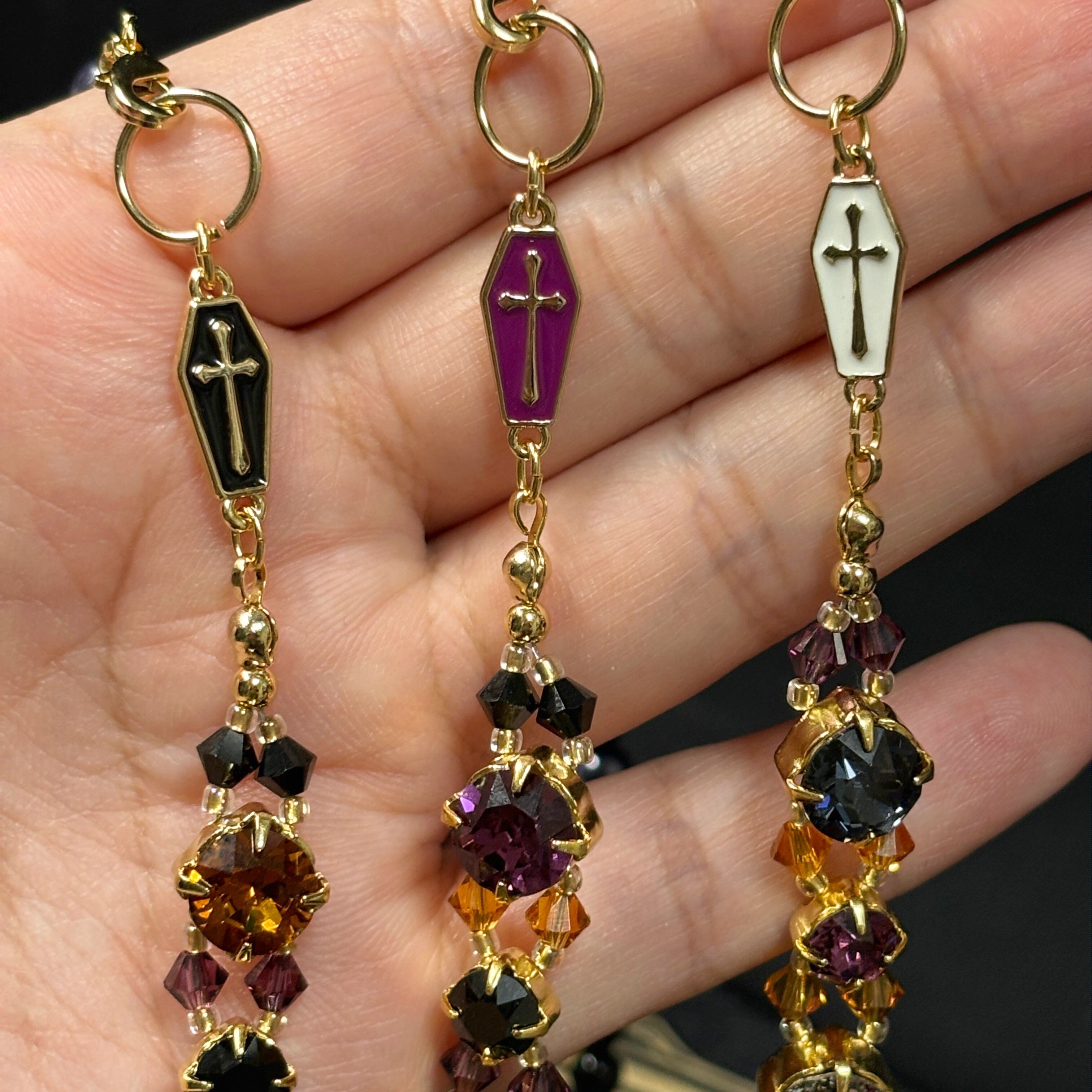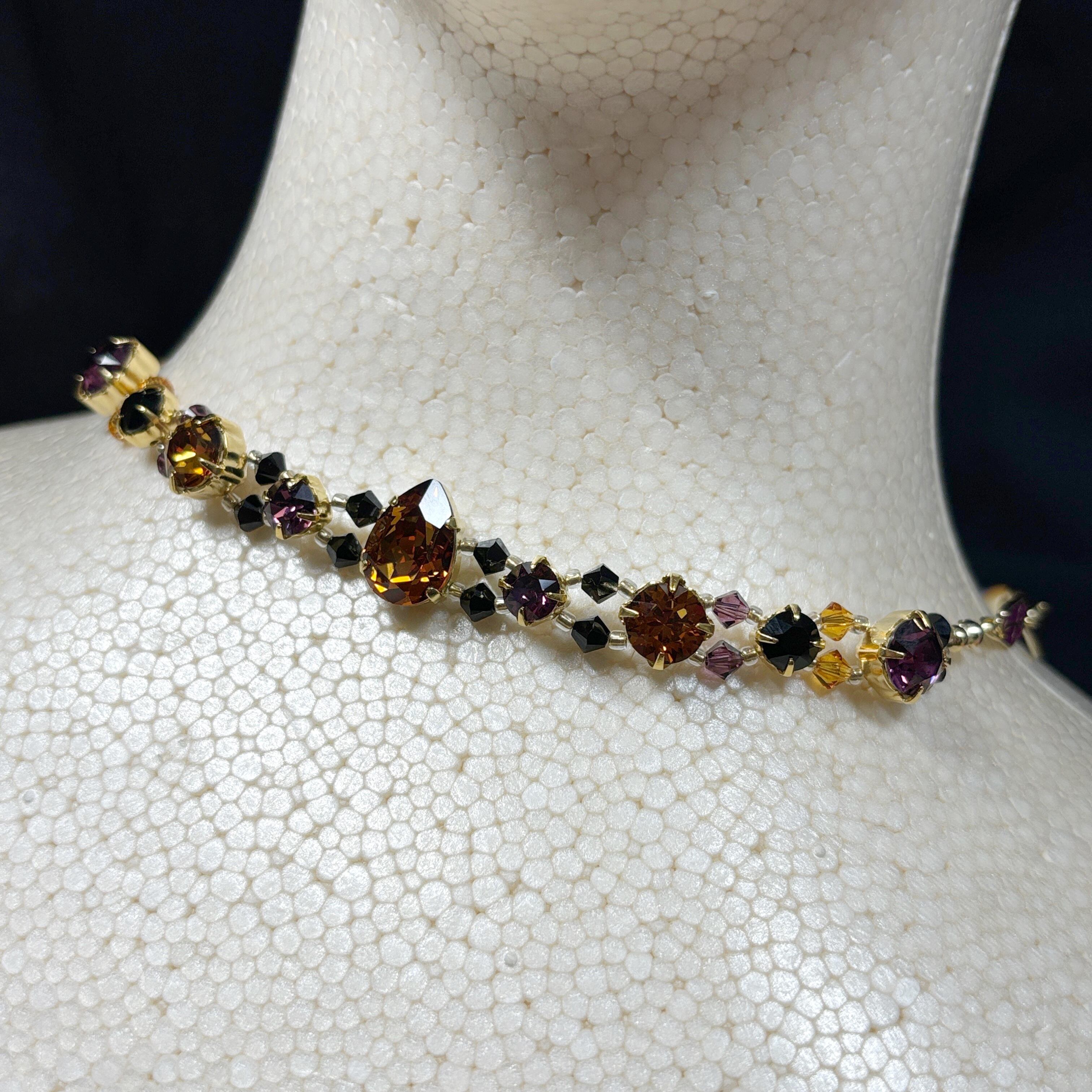 ライトアンバーの貴和クリスタルをメインに、ジェット、アメジストの貴和クリスタルを使っています。パールは黒と…過去在庫で名前不明。金具ゴールド。